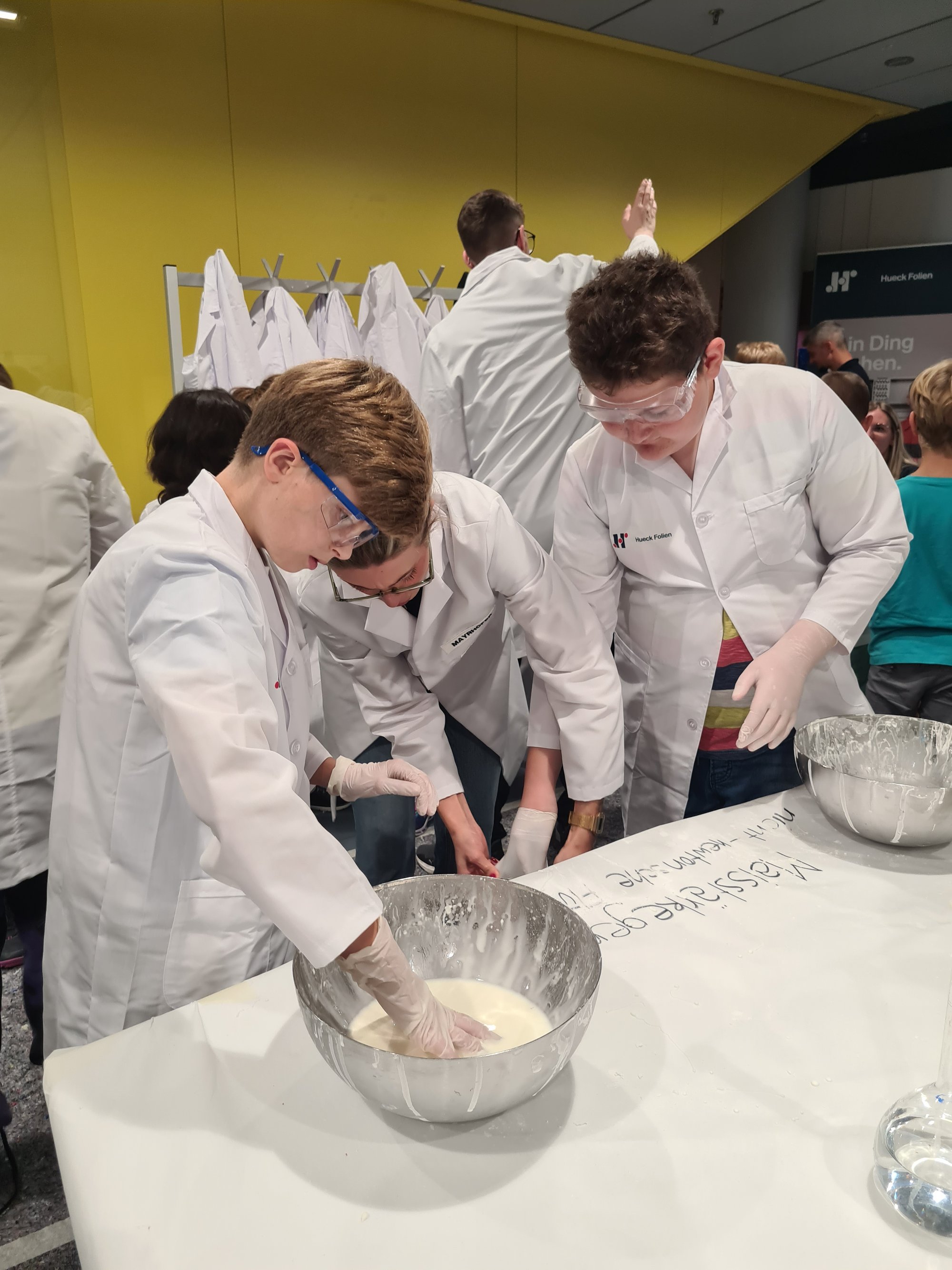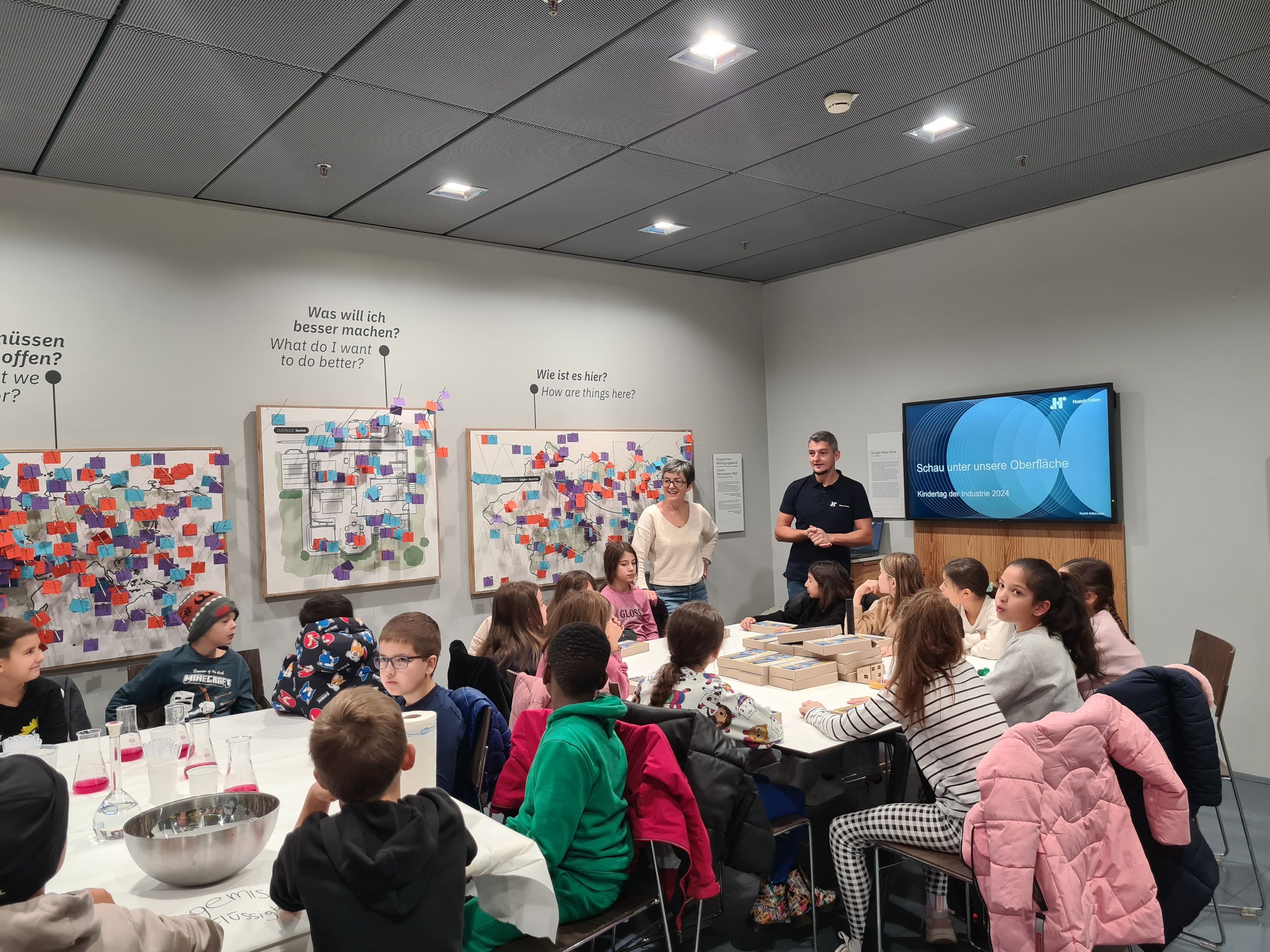 Getreu unserem Workshop-Motto "Schau unter unsere Oberfläche" veranschaulichte unser Team auf altersgerechte Weise welche physikalischen, chemischen und technischen Eigenschaften die Oberflächenbeschichtungen von Hueck Folien so einzigartig machen. Die verschiedenen Stationen zu Licht und Optik, erneuerbaren Energien und Chemie boten den jungen Forscher:innen spannende Einblicke und praktische Erfahrungen in Physik, Chemie und Technik.