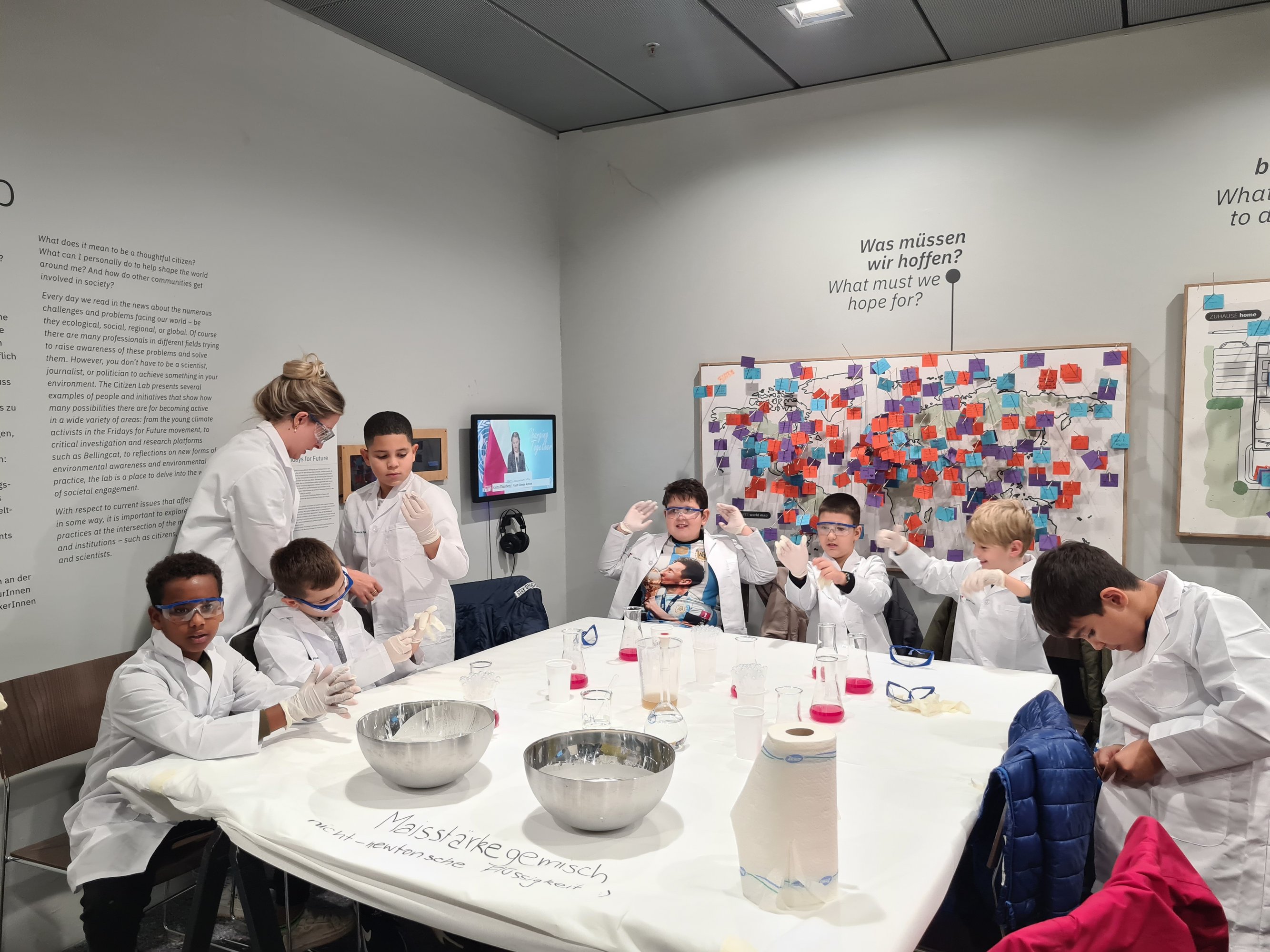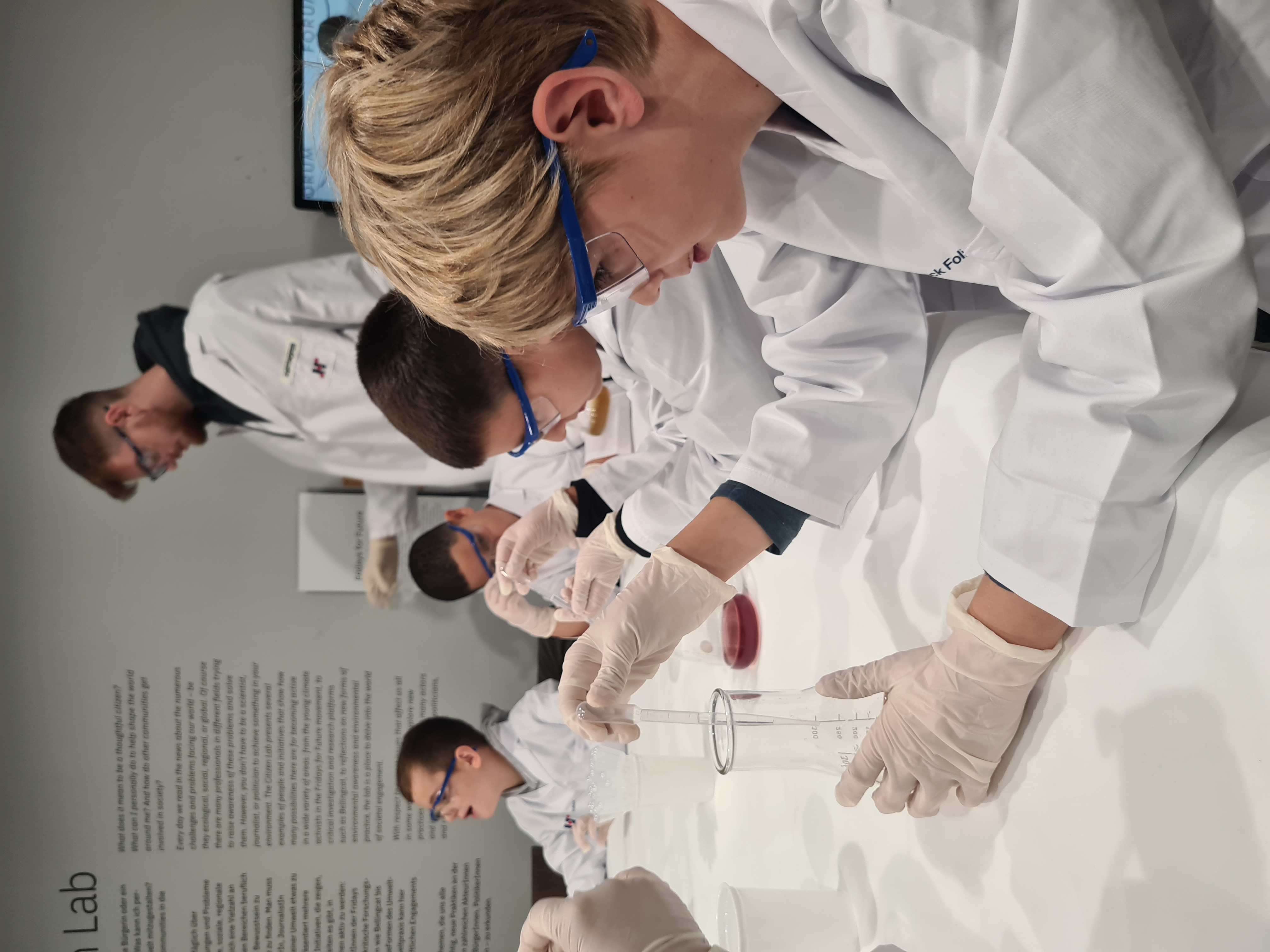 An der Station "Chemie" konnten die Kinder in die Welt der Farben und Lacke eintauchen. Ausgestattet mit Mänteln, Schutzbrillen und Handschuhen führten sie spannende chemische Versuche durch und lernten, wie verschiedene Stoffe miteinander reagieren. Experimentiert wurde unter anderem mit einfachen Alltagsutensilien, wie Rote-Bete-Pulver und Maisstärke. Diese praktischen Versuche vermittelten den Kindern ein grundlegendes Verständnis für chemische Prozesse.