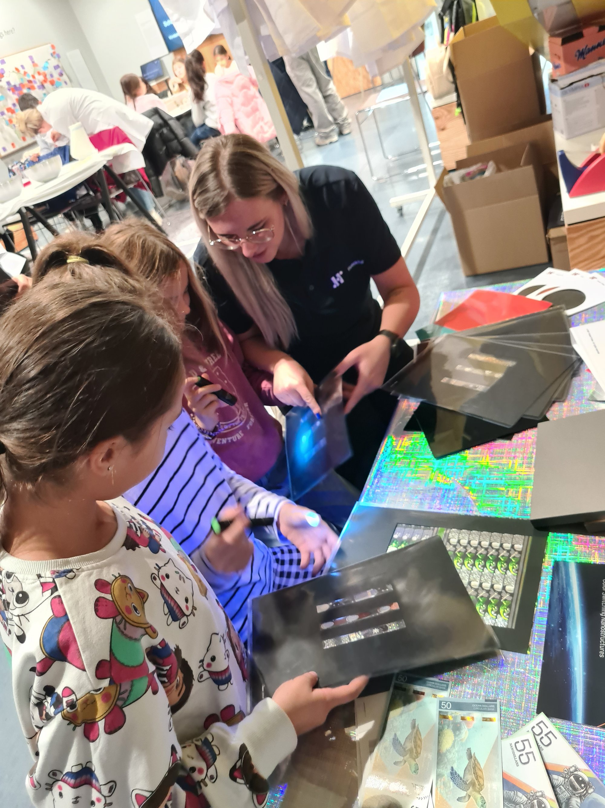 An der Station "Licht & Optik" beschäftigten sich die Kinder mit Themen wie Lichtbrechung, Lichtbeugung und Hologrammen. Durch praktische Experimente mit unseren Folien, Fäden und Streifen, die in Banknoten und Dokumenten zum Einsatz kommen, wurden faszinierende optische Effekte sichtbar gemacht. Die Kinder arbeiteten unter anderem mit Mikroskopen, Fadenzählern und UV-Licht. Diese Station weckte nicht nur das Interesse an physikalischen Phänomenen, sondern zeigte auch, wie diese in der realen Welt angewendet werden und zu höchstem Fälschungsschutz bei Banknoten beitragen.